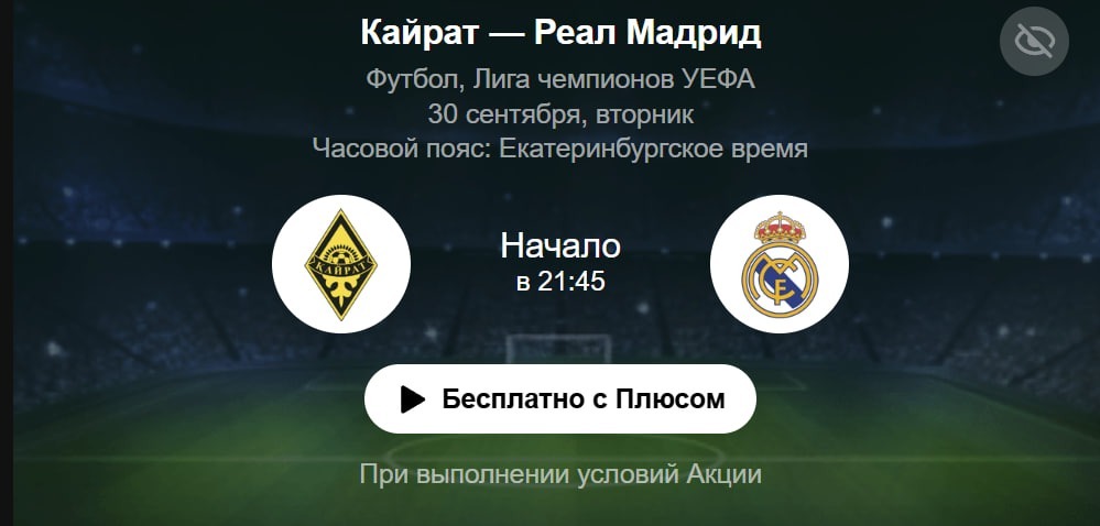 Кинопоиск предлагает трансляцию матча Кайрат — Реал в максимальном качестве с дополнительными функциями.