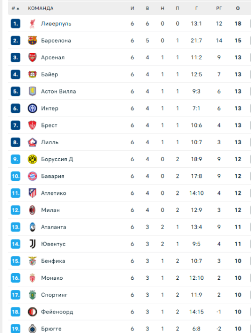 Следом идут шесть команд, у которых по 13 очков: «Арсенал», «Байер», «Астон Вилла», «Интер», «Брест» и «Лилль». Каждая из них сохраняет шансы на попадание в восьмерку сильнейших и прямой выход в 1/8 финала.