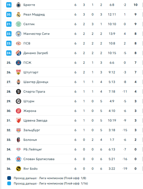 Победители двух прошлых розыгрышей Лиги чемпионов, «Реал» и «Манчестер Сити», идут в самом низу зоны «стыков»: мадридцы — на 20 месте, «горожане» — на 22-м. Напомним, что в стыковых матчах за выход в плей-офф сыграют команды, которые по итогам общего этапа займут места с 9-го по 24-е.